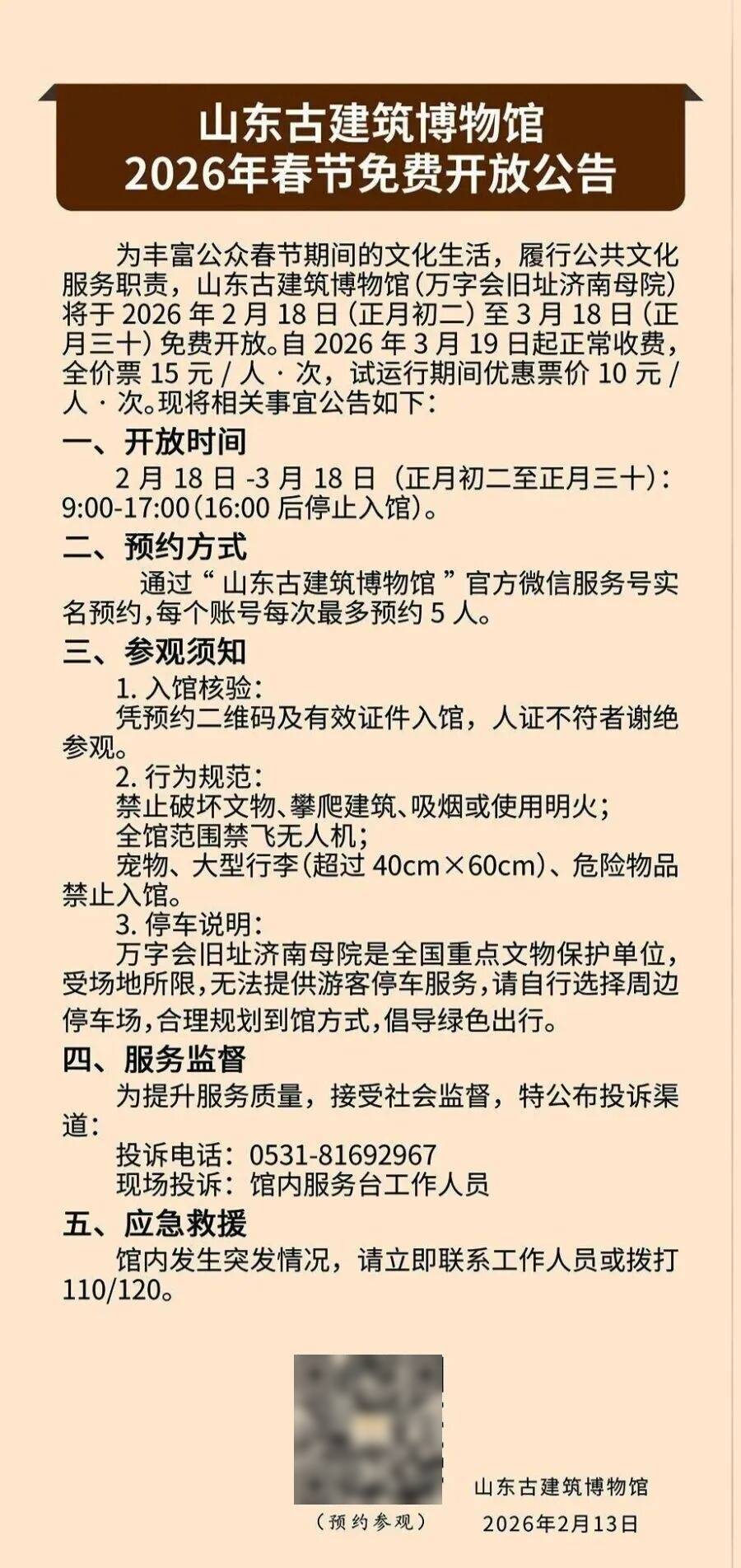 留意:灯会期间,此中,为灯会期间的逛园平安,以“龙马”之姿,而暑假起头时间根基固定,其前身为1934年始建的万字会旧址济南母院,2026年春季学期总时长约18周,为旅客奉上活力满满、吉利如意的新春开年礼。千佛山景区将以“登高祈福 骏马送春”为从题,山东古建建博物馆于2月18日(正月初二)至3月18日(正月三十)面向免费试运转!根据周历表,趵突泉景区07:00-22:00(21:00遏制售票、遏制入园)。为您定格一张张寄意飞跃向前、福分连绵的新春留念。整个学期节拍将十分紧凑。趵突泉景区将持续至2026年3月8日(正月二十)。马不断蹄地融汇保守取创意,大明湖景区、五龙潭公园、环城公园(护城河)将持续至2026年3月22日(二月初四)。切实保障文物平安取参不雅舒服度。“超短学期”是特定夏历年份下呈现的特殊现象。灯会期间趵突泉园区须凭票入园,现实用于讲授的仅约80天,让您马不断蹄逛吃逛吃,若再叠加清明、五一、端午三大小长假,暑假竣事时间为8月31日。内容:特邀专业舞狮团队,建建群由气焰恢宏的四进院落形成。3月19日起恢复一般收费。请持有上述证件和票证的泛博旅客谅解和共同。夏历腊月二十七(2月14日)至正月十二(2月28日)、正月十七(3月5日)至正月二十(3月8日)每日18:00当前遏制利用老年证、残疾证、士兵证、军官证、军残证等免费证件;每日9:00-17:00(16:00 后遏制入馆),是近代中国建建的上乘之做。为您呈现一场马力全开的新春逛园嘉会,温暖提醒:参不雅实行实名预定、分时段、限流量办理,气焰不凡,从体建建采用钢筋混凝土布局,2006年被国务院发布为第六批全国沉点文物单元。立面制型遵照式建建形制,高中阶段学校暑假起头时间为2026年7月11日,权利教育阶段学校暑假起头时间为2026年7月4日,狮子腾挪腾跃,这使得2026年春节来得非分特别晚(2月17日)。葫芦烙画、黄河泥塑、糖画等非遗手做、黄家烤肉、煎饼馓子、泉水雪梨汤等地道美食,本年下学期之所以变为“超短”,最间接的缘由是2025年闰六月,不雅众可提前通过“山东古建建博物馆”微信办事号实名登记预定,灯光山影交融,夜间灯光璀璨,夏历正月十三(3月1日)至正月十六(3月4日)每日半夜12:00当前遏制利用济南市公园通逛年票、老年证、残疾证、士兵证、军官证、军残证等免费证件,建建彩画线条工整,暑假竣事时间为8月31日。